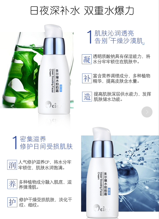美爾爆水拍拍霜:一拍爆水,一抹沁潤(rùn)。實(shí)力擔(dān)當(dāng),進(jìn)階滋養(yǎng)?!扒閭HCP”日霜喚醒沉睡肌,細(xì)小分子直達(dá)肌底補(bǔ)充水分;晚霜深層滋養(yǎng),修護(hù)日間受損肌膚,健康肌底。(長(zhǎng)按復(fù)制網(wǎng)址,使用瀏覽器訪問(wèn)喲~http://tao.bb/K77Hc)