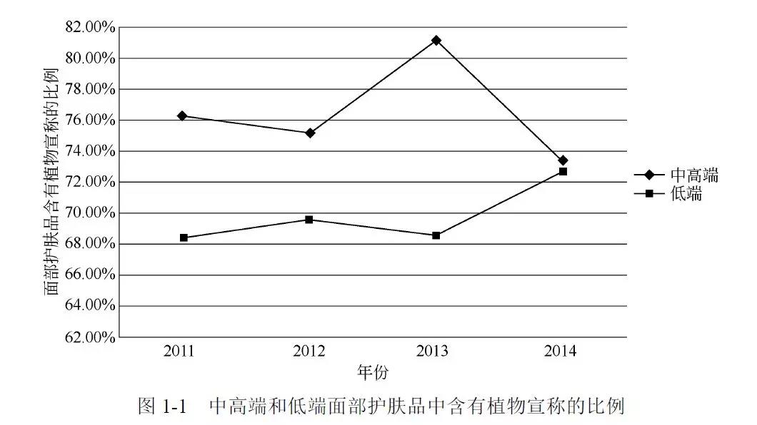 從消費角度來看,中國已成為全球五大面部護膚品消費市場中最大的消費國,接著是日本、韓國、美國以及法國。2014年植物類產(chǎn)品以64%的消費占比成為消費者使用最多的產(chǎn)品類型。其主要原因是在中高端和低端面部護膚品中植物宣稱比例均較高,由此也覆蓋了不同消費水平的消費人群。據(jù)統(tǒng)計:2011~2014 年中高端面部護膚品中3/4 的產(chǎn)品含有植物宣稱,且這個趨勢一直比較穩(wěn)定;2011~2014 年,低端產(chǎn)品中含有植物宣稱的產(chǎn)品也逐步上升;到2014 年,低端產(chǎn)品和高端護膚產(chǎn)品中含有植物宣稱的產(chǎn)品比例已經(jīng)大致相同。
