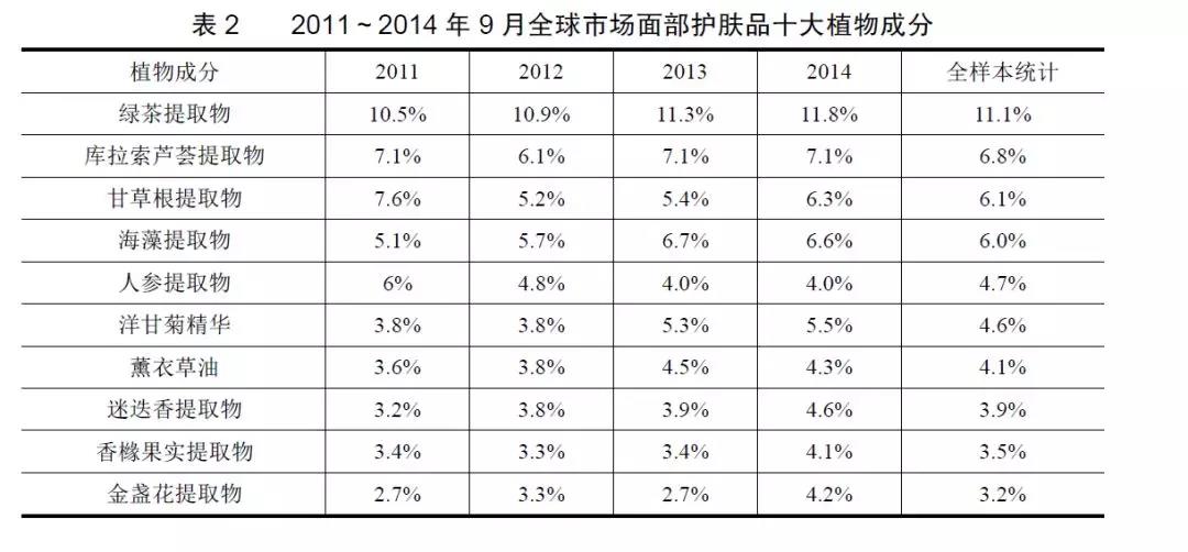 在世界范圍內(nèi),綠茶、蘆薈和甘草在護膚品中使用頻率最高,其中綠茶成分一直高居榜首,這和中國市場內(nèi)的情況完全相同。近年,薰衣草精油、迷迭香提取物等也呈現(xiàn)增長的趨勢(見表2)。