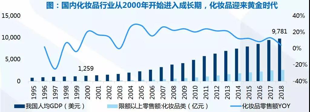 2018年中國(guó)人均GDP為9781美元,略高于日本1982年的發(fā)展水平,參考日本經(jīng)驗(yàn),隨著我國(guó)經(jīng)濟(jì)持續(xù)增長(zhǎng)和居民消費(fèi)水平提升,化妝品消費(fèi)有望迎來(lái)黃金時(shí)代。