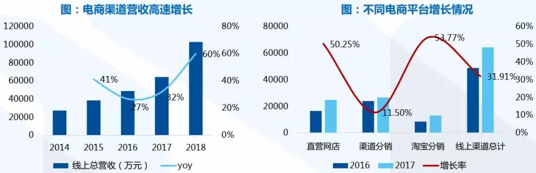電商渠道收入復(fù)合增速達(dá)37%,以經(jīng)銷(xiāo)模式為主,主要由代運(yùn)營(yíng)公司負(fù)責(zé)。公司電商收入占比從2014年的17.4%提高至2018年的41.8%,提升了24.4個(gè)百分點(diǎn),其中經(jīng)銷(xiāo)電商占比更高、增長(zhǎng)更快,2018年經(jīng)銷(xiāo)和直營(yíng)電商收入占比分別為30%和12%,近4年?duì)I收復(fù)合增速分別為42%和28%。公司電商渠道主要委托廣州涅生電商公司代運(yùn)營(yíng);2013年公司開(kāi)拓經(jīng)銷(xiāo)電商渠道,選擇美妮美雅作為唯品會(huì)、聚美優(yōu)品、京東等電商平臺(tái)的唯一授權(quán)經(jīng)銷(xiāo)商。