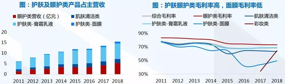 以高毛利眼護(hù)產(chǎn)品為特色,膏霜乳液和眼護(hù)產(chǎn)品是主要業(yè)績(jī)來(lái)源。在公司的產(chǎn)品結(jié)構(gòu)中,膏霜乳液類(lèi)和眼部護(hù)膚產(chǎn)品收入占比最高,2018年公司銷(xiāo)售的產(chǎn)品涵蓋乳液膏霜、眼部護(hù)膚、肌膚清潔、面膜和彩妝,收入占比分別為47%/34%/13%/5%/2%,從變化趨勢(shì)來(lái)看,眼部護(hù)膚和面膜產(chǎn)品收入占比有所提升,其余品類(lèi)收入占比略有下降。2018年分品類(lèi)毛利率分別為:眼部護(hù)膚73.0%、膏霜乳液68.8%、肌膚清潔63.2%、面膜49.4%、彩妝64.4%,乳液膏霜和眼護(hù)產(chǎn)品是主要利潤(rùn)來(lái)源。