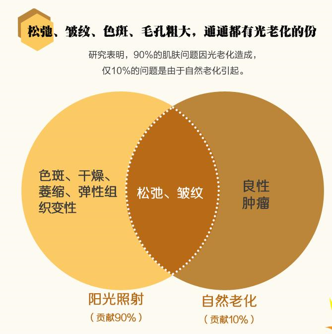 你知道嗎,造成你肌膚問題的元兇中,基本上都有它的份兒。毛孔粗大、皺紋松弛、色素沉淀,導(dǎo)致這些肌膚問題的因素中,約90%是由陽光貢獻(xiàn)的,只有10%才是真正的“歲月痕跡”。是的,光老化就是這么可怕。女人的第一道皺紋長(zhǎng)在夏天,夏天的高溫對(duì)皮膚具有極大的殺傷力。研究表明,爆曬10分鐘,皮膚會(huì)早衰10天:夏季不好好防曬,你的皮膚會(huì)衰老三年,這就是光老化的厲害。?