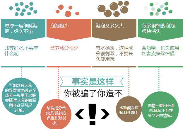 3、泡泡很多很細(xì),而且很快就消失了,說明含酒精。不要長期的使用,容易傷害皮膚的保護(hù)膜。