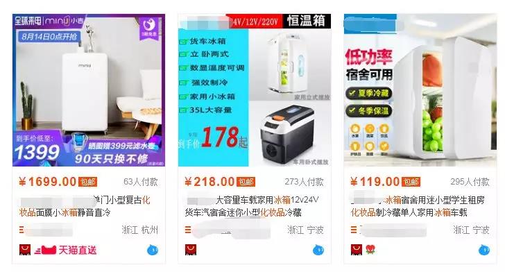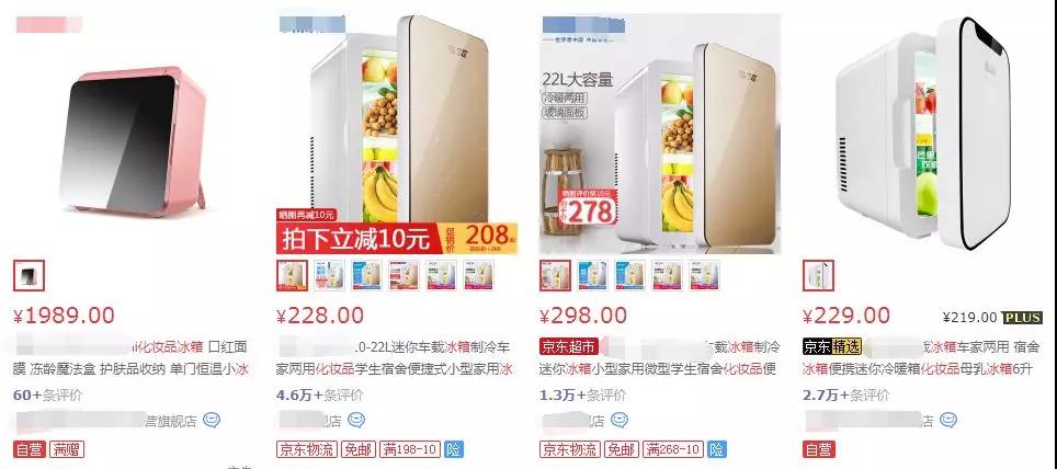 在電商平臺上搜索,打著“專業(yè)化妝品冰箱”頭銜的產(chǎn)品不少。這些專業(yè)化妝品冰箱均有著時尚的外觀、為化妝品定制的分區(qū)和格口、恒溫儲存功能,有的還著重突出抑菌功能,價格比同等大小的普通冰箱貴幾百到上千元不等。一些普通車載、家用小冰箱,也趁機(jī)蹭了“化妝品冰箱”的熱度——比如在商品標(biāo)題中提及化妝品,但實(shí)際該冰箱并無專門為儲存化妝品而定制的功能。