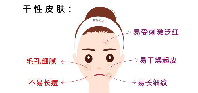膚質(zhì)細(xì)膩較??;皮脂分泌少無(wú)油膩;皮膚較干燥不易現(xiàn)痤瘡;易老化起皺紋;易受環(huán)境刺激不易過敏。如果您是干性皮膚請(qǐng)一定保證皮膚得到充足的水分。