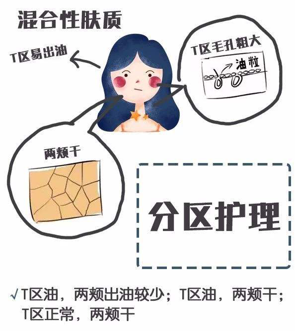如果只有T區(qū)(即額頭和鼻翼兩側(cè))出油,那就表明是“混合型膚質(zhì)”(混合型膚質(zhì),“既干又油”,一般是在T區(qū)較油,而兩頰又很干,這樣在護(hù)理起來(lái)會(huì)有些麻煩,所以在選擇護(hù)膚品的時(shí)候,要區(qū)分開來(lái),分別對(duì)待,既得照顧到補(bǔ)水,保濕,又得照顧到控油方面)。